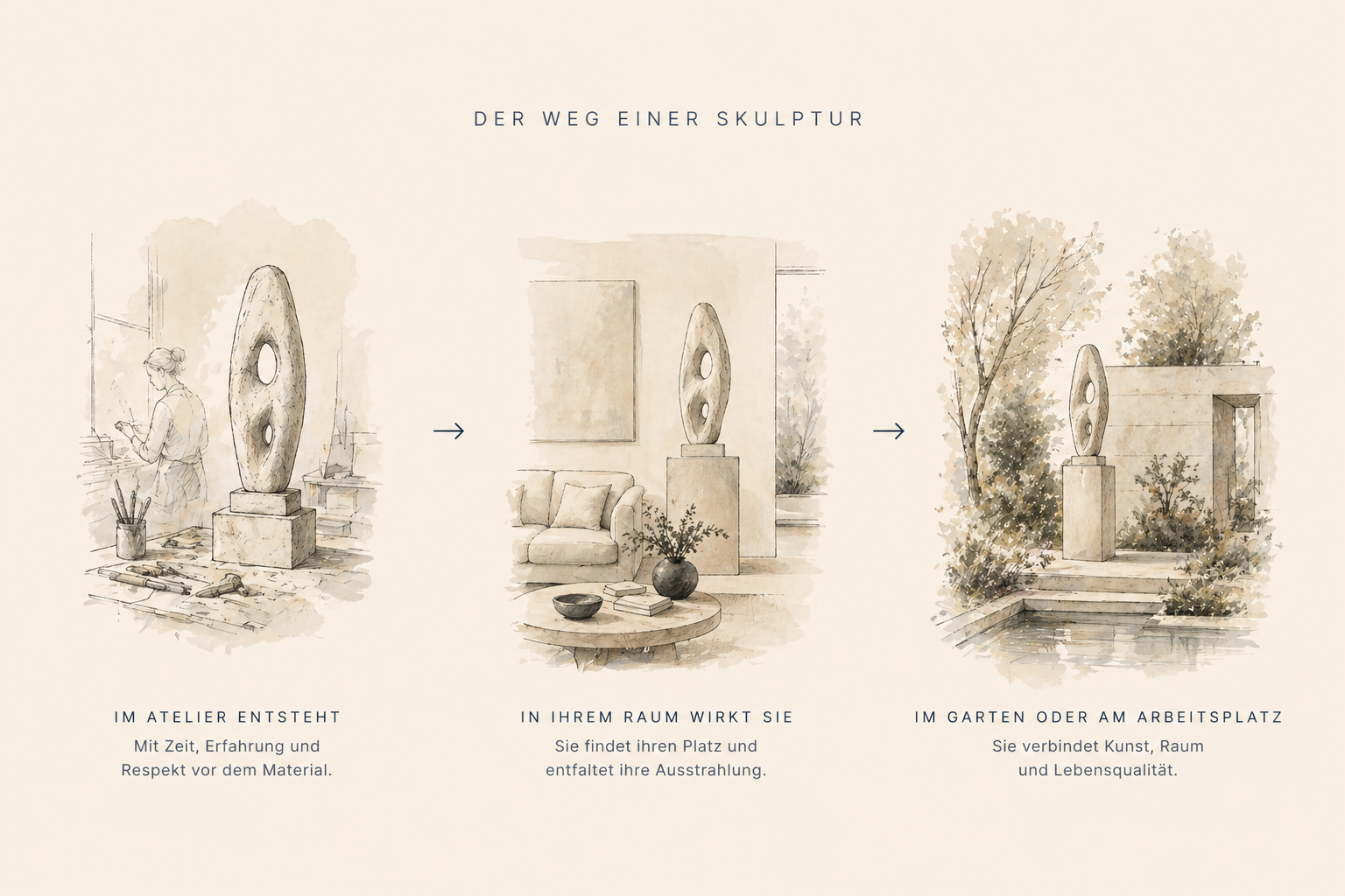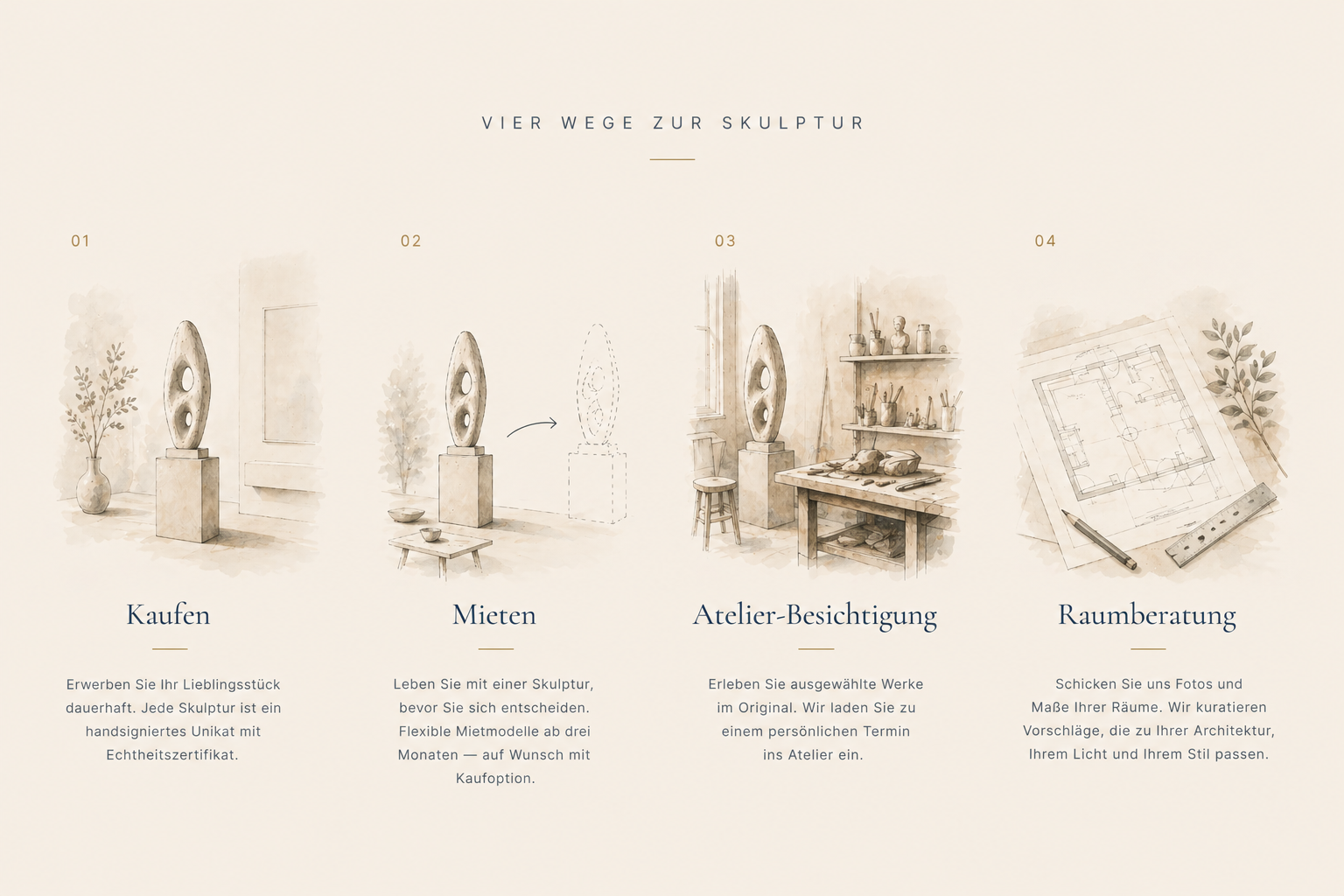 Lebe mit einer Skulptur, bevor du dich entscheidest. Flexible Mietmodelle ab drei Monaten — auf Wunsch mit Kaufoption.